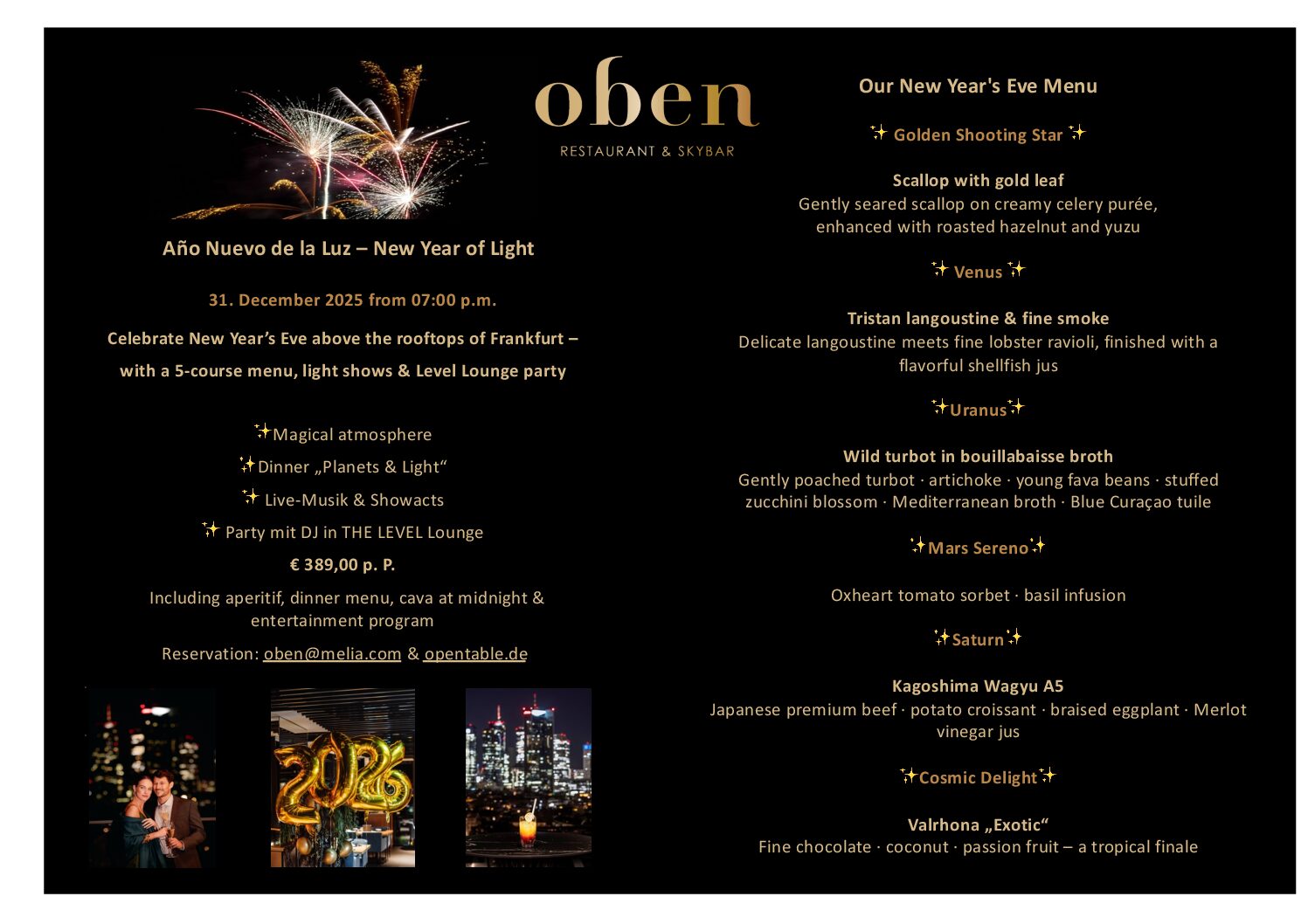 As the old year fades into golden shadows and the new one awakens in shimmering brilliance, we invite you to an evening that celebrates light in all its facets – as a symbol of hope, renewal, and indulgence.
