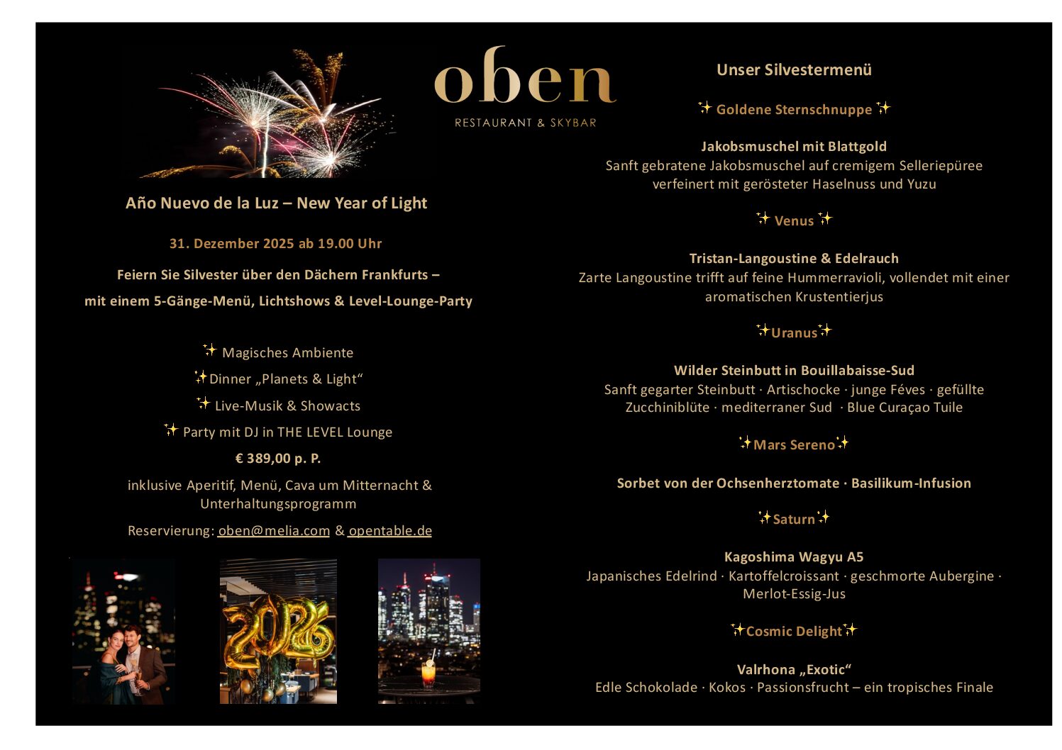 Für Reservierungen und Rückfragen können Sie gerne unser Kontaktformular nutzen oder schreiben Sie uns einfach via mail an oben@melia.com. Telefonisch erreichen Sie uns in aller Regel zu unseren Restaurant – Öffnungszeiten unter +49 (0) 69 6681 984084. Selbstverständlich können Sie auch Gutscheine erwerben und somit ein kulinarisches Erlebnis bei uns im Restaurant oben & Skybar  verschenken.